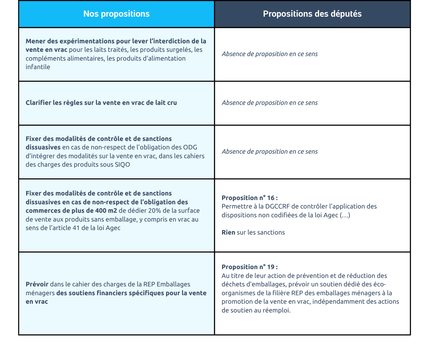 Réseau Vrac et Réemploi salue par ailleurs le travail des députés qui ont associé à chacune des 100 propositions, les véhicules législatifs ou règlementaires à utiliser pour les faire aboutir (décrets, arrêtés, lois françaises ou européennes, cahiers des charges des filières REP).