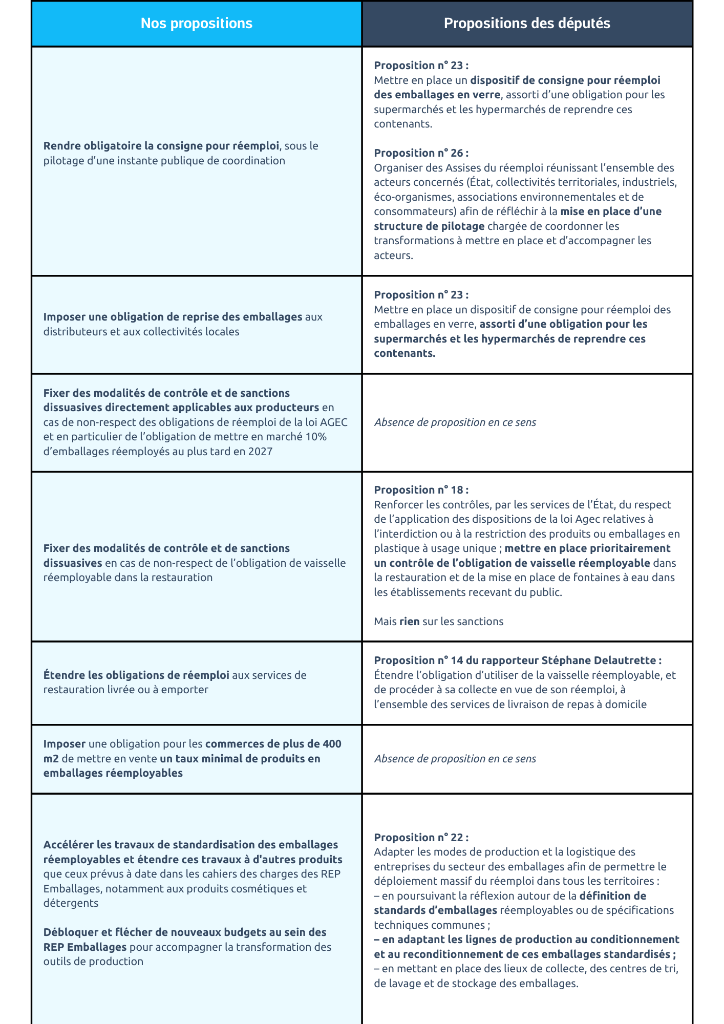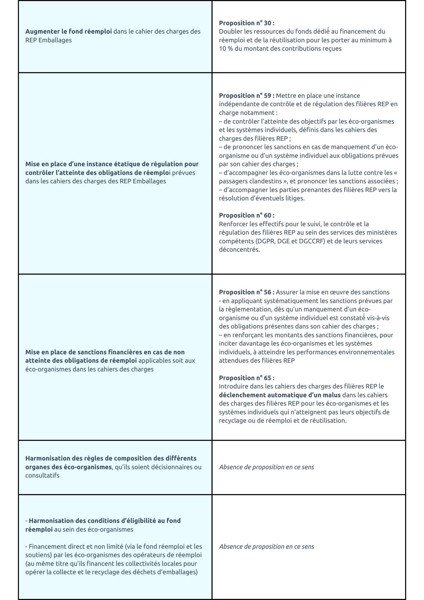 Réseau Vrac et Réemploi est globalement alignée sur les constats formulés dans le rapport ainsi que sur les propositions des députés, en particulier celles relatives à la nécessité de mettre en place des contrôles et des sanctions dissuasives en cas de non-respect des obligations de réemploi, qu’elles soient imposées directement aux producteurs, ou indirectement par l’intermédiaire de leur éco-organisme.