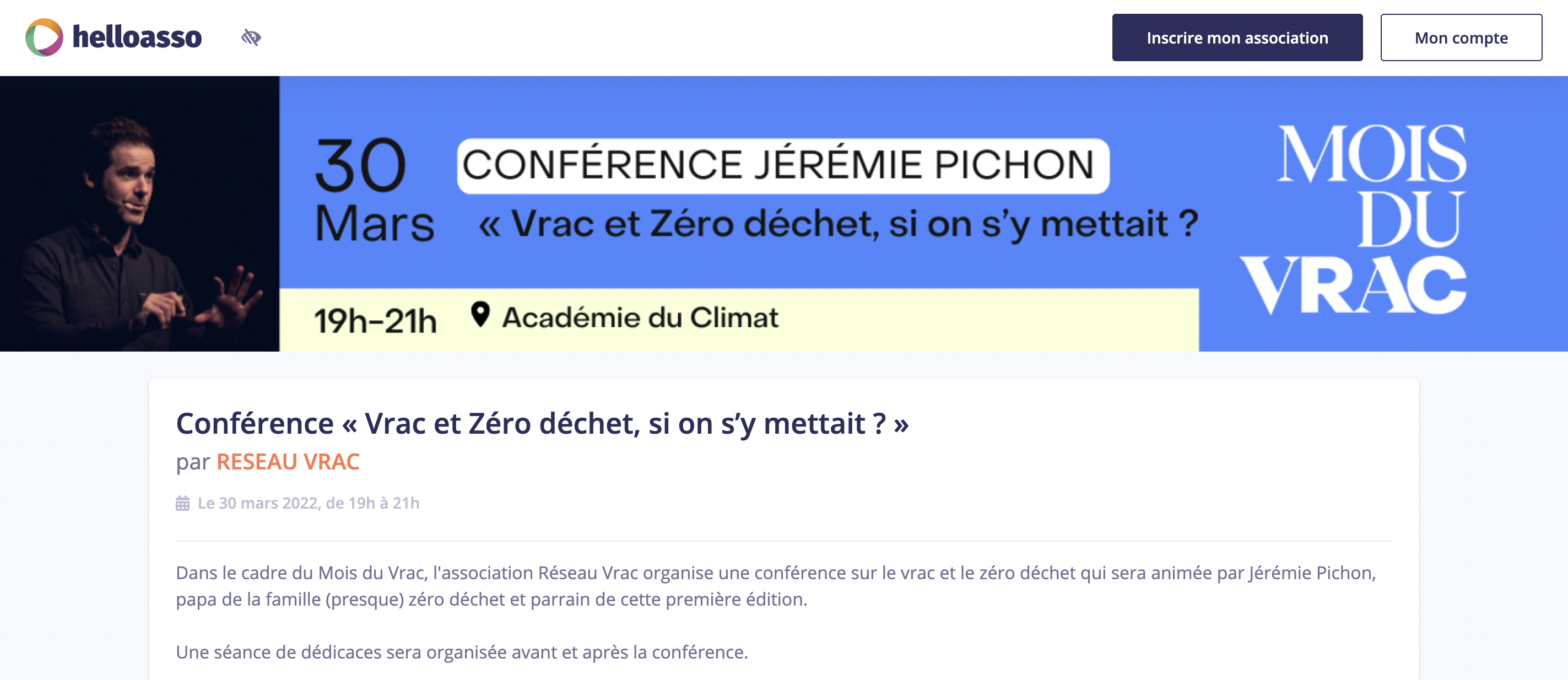 Le Mois du Vrac sera clôturé par une conférence de 2h de Jérémie PICHON, papa de la famille (presque) zéro déchet et parrain de l’opération, à l’Académie du Climat, mercredi 30 mars.
