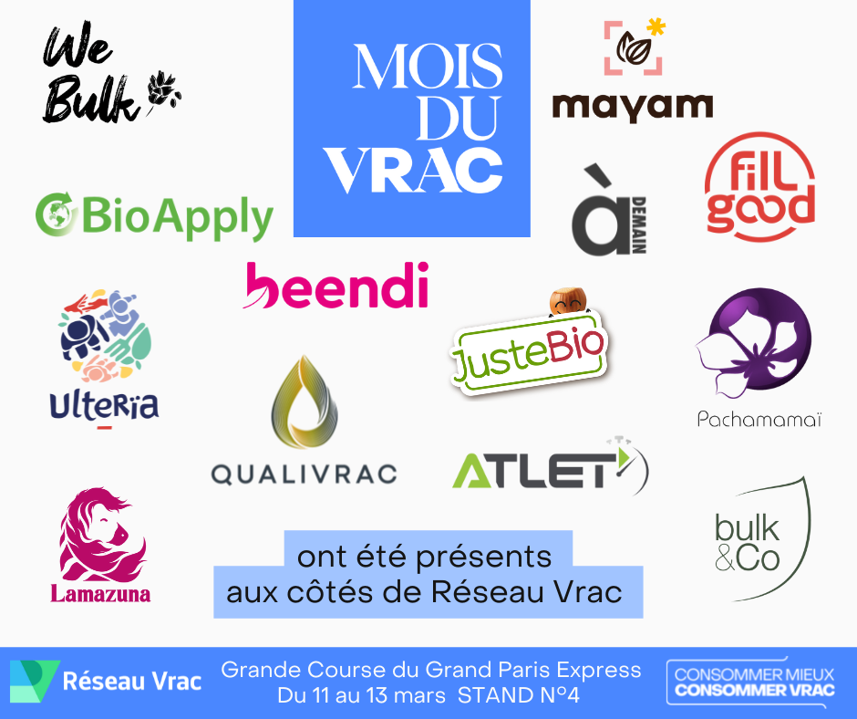 Les 11, 12 et 13 mars dernier, Réseau Vrac rencontrait pour la 1ère fois le grand public lors d’un événement citoyen avec un stand de 25m installé sur le parvis du Stade de France pour la Grande Course du Grand Paris Express. Durant ces 3 jours, les visiteurs ont découvert une véritable immersion dans l’univers du vrac, en découvrant la pluralité des produits disponibles en vrac, la possibilité de se servir en vrac et d’apprendre à manipuler les équipements de vente ; des quiz, un concours avec 300 lots vrac à gagner ou encore un photocall aux couleurs de notre campagne de communication « consommer mieux, consommer vrac » ont suscité la curiosité des visiteurs.