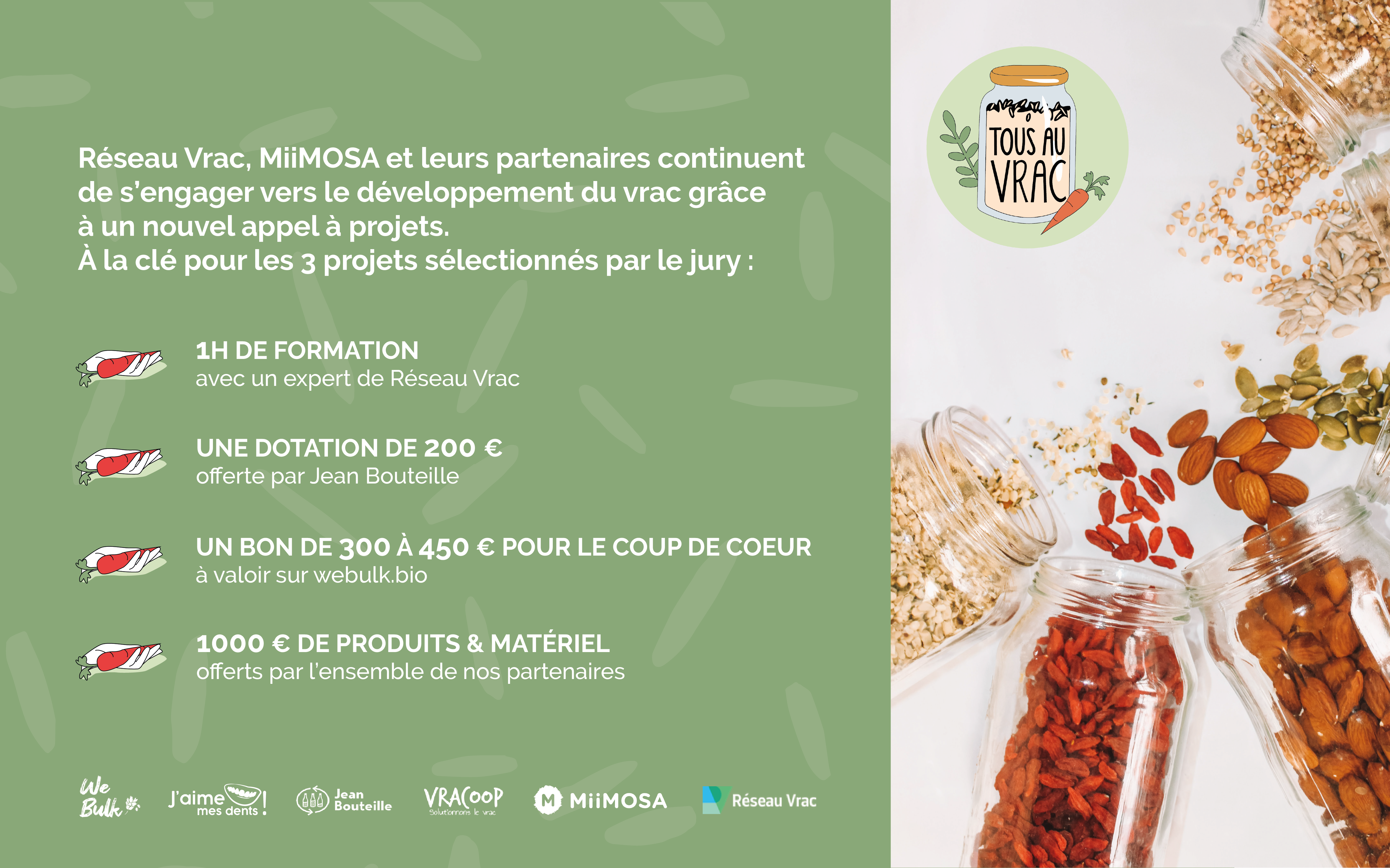 TOUS AU VRAC : c’est terminé ! Après 6 mois d’appels à projets, les 3 lauréats ont été élus cette semaine, par l’ensemble des partenaires de l’opération, MiiMOSA et nous !