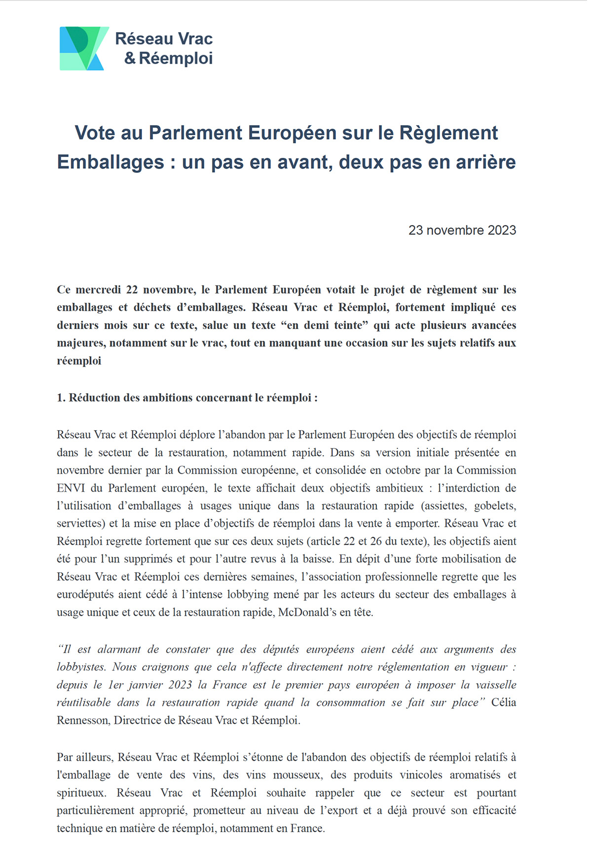 Vote au Parlement Européen sur le RèglementEmballages : un pas en avant, deux pas en arrière